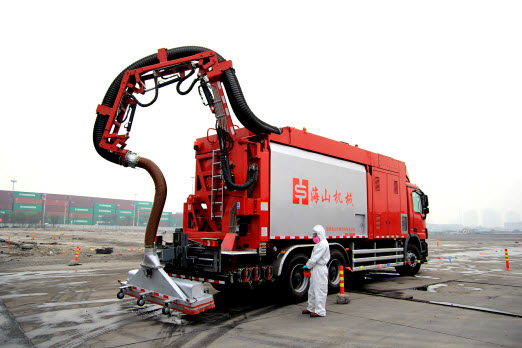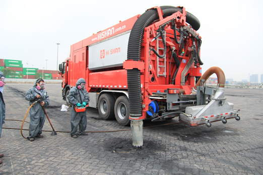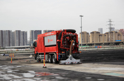 本次施工改變了傳統的由清掃車清掃作業、灑水車高壓沖洗、多種洗消設備聯合作業的施工模式,由一臺抽吸車即可完成,對污染物的清除率達到現場的環保施工要求。相對于傳統的作業方式,全密閉、無拋灑、地表清洗干凈,工作效率提升5倍以上。